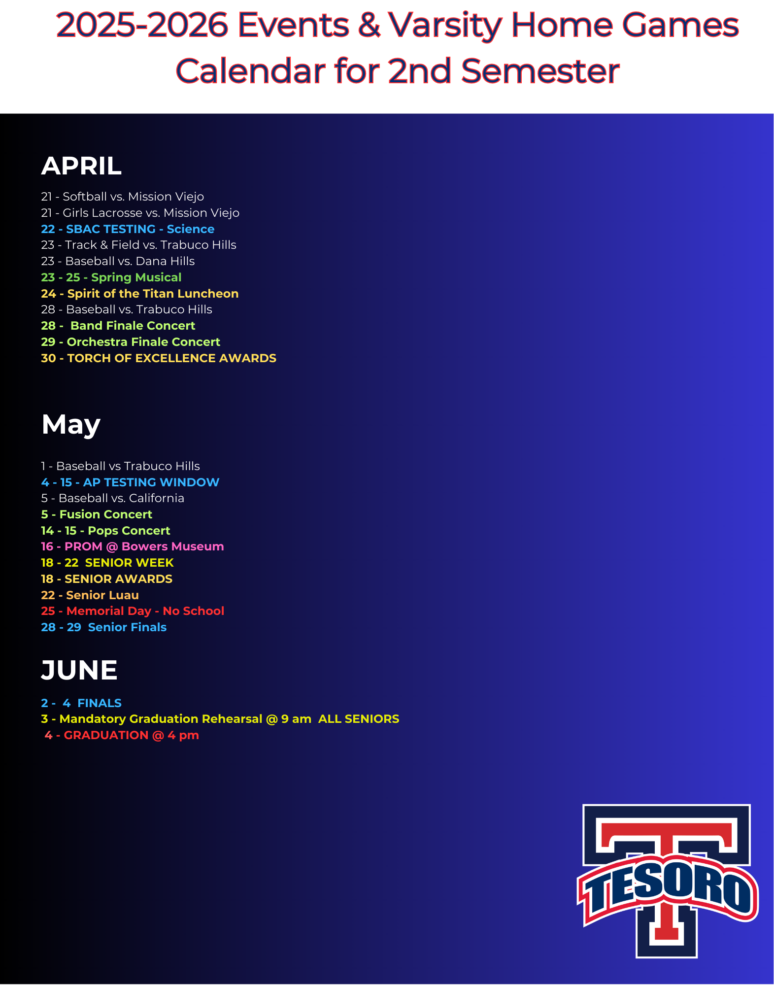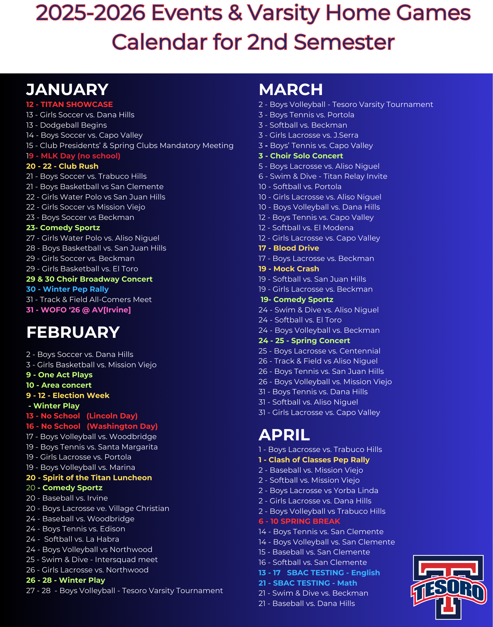 2nd Semester Events & Home Varsity Games